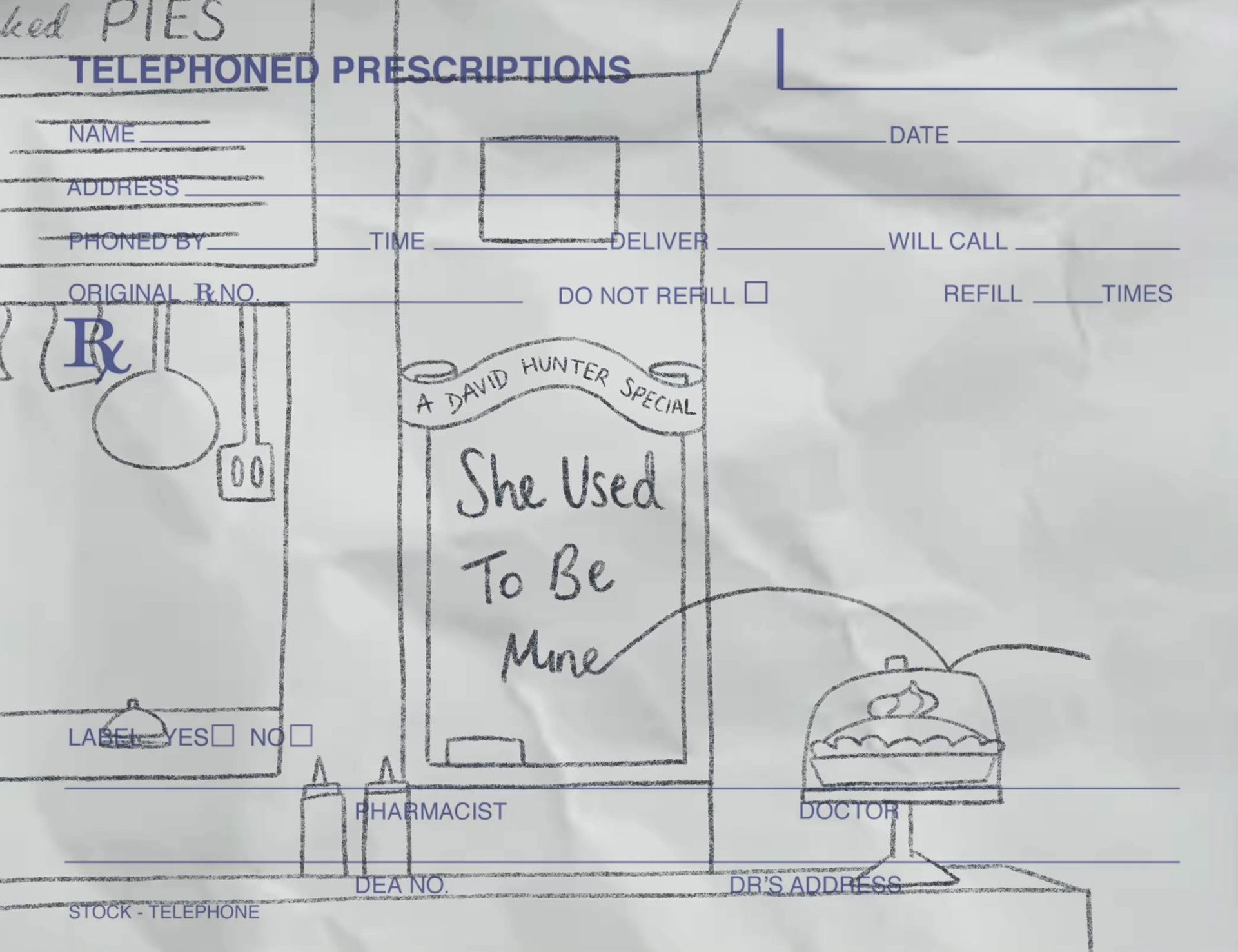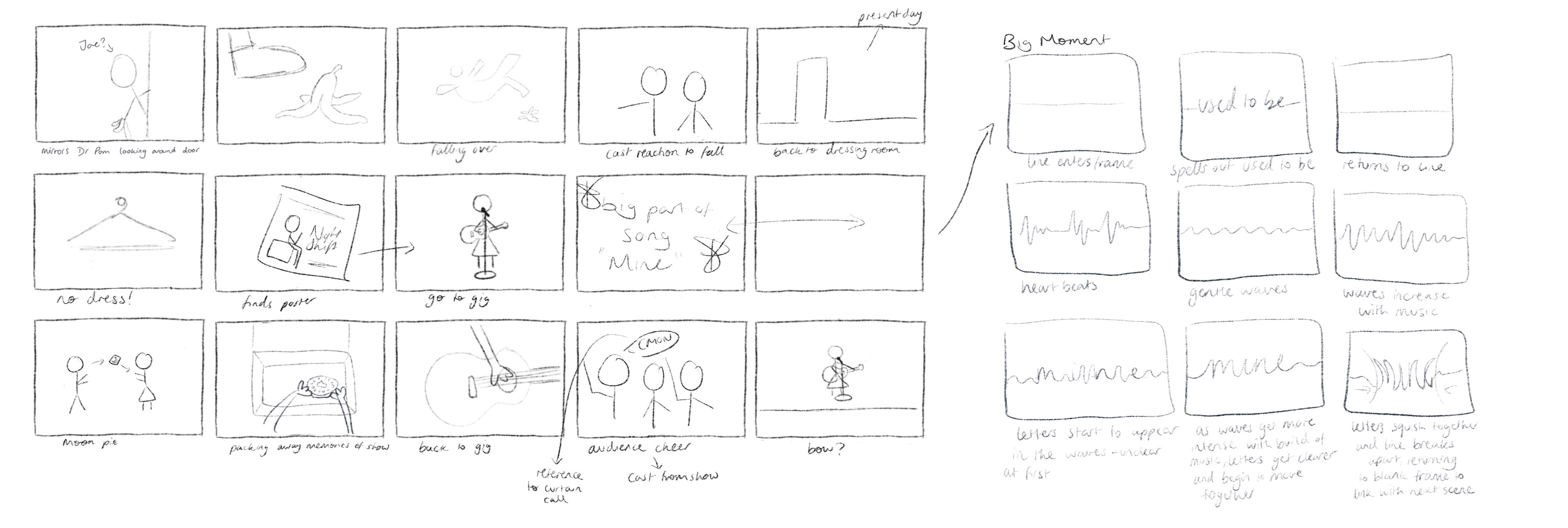 Brief: Create an animated music video for She Used To Be Mine, telling the story of David Hunter’s time in Waitress. The video will be in the style of David’s drawings made on stage whilst playing Dr Pomatter in the West End, using his Dr Pomatter and Jenna character designs as a starting point. It will be released alongside the song and used to promote David’s gig ‘Night Shift’ at Lafayette, London.