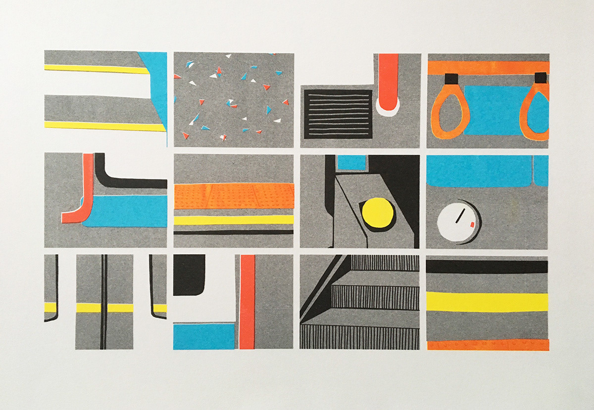 Extracting small details from my daily commute on the London Underground, exploring shape and colour, first in collage and then in riso print