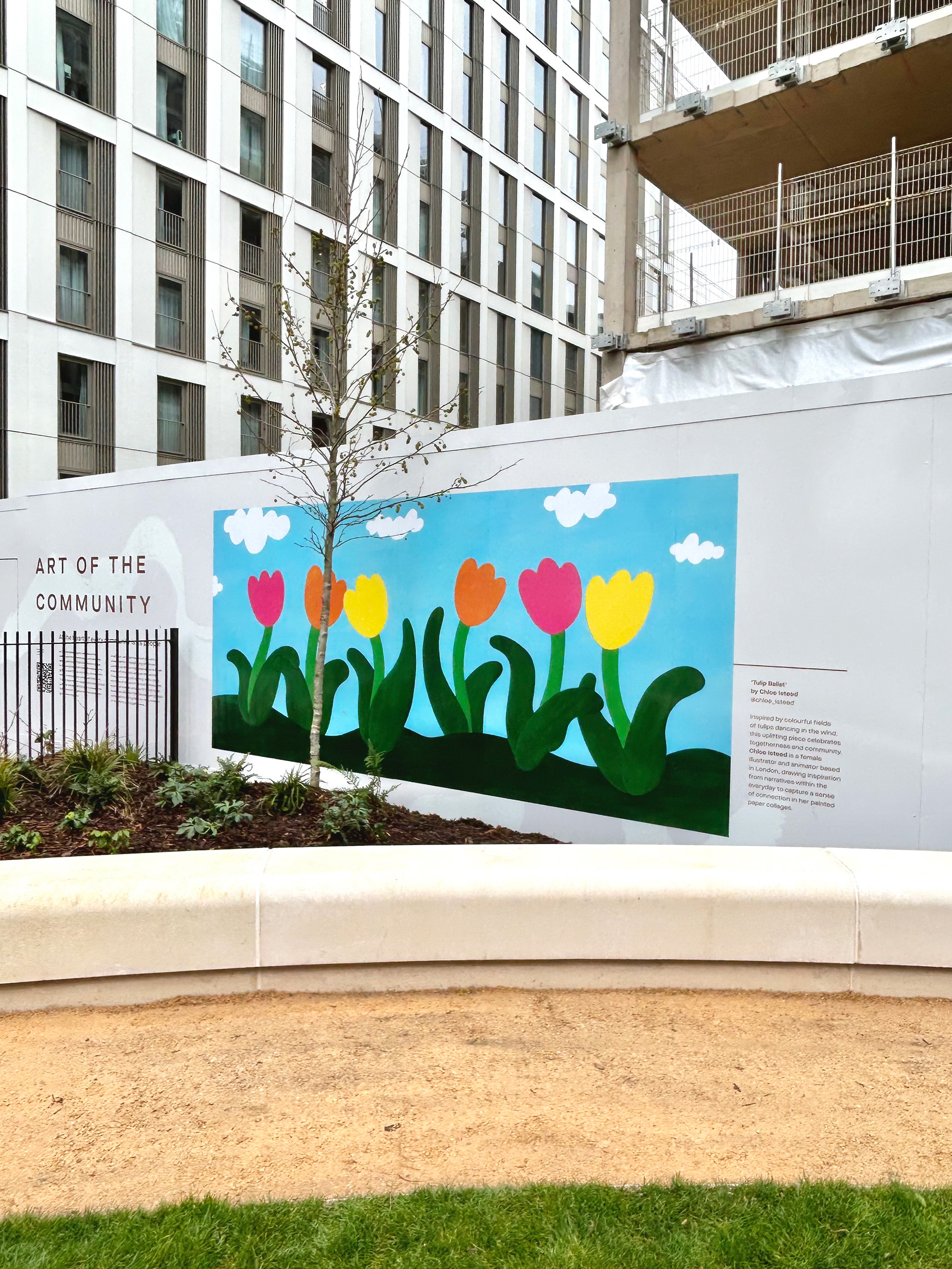 Commissioned by Coppermaker Square and curated by Laura Nevill from Let's Do London Better. The hoarding surrounding Coppermaker Square's new wellness garden features artwork by six female artists, exploring themes of nature and mental health. The garden offers a space for the public to reflect and enjoy some time in nature. 'Tulip Ballet' is inspired by coloured fields of tulips dancing in the wind, celebrating community and togetherness.