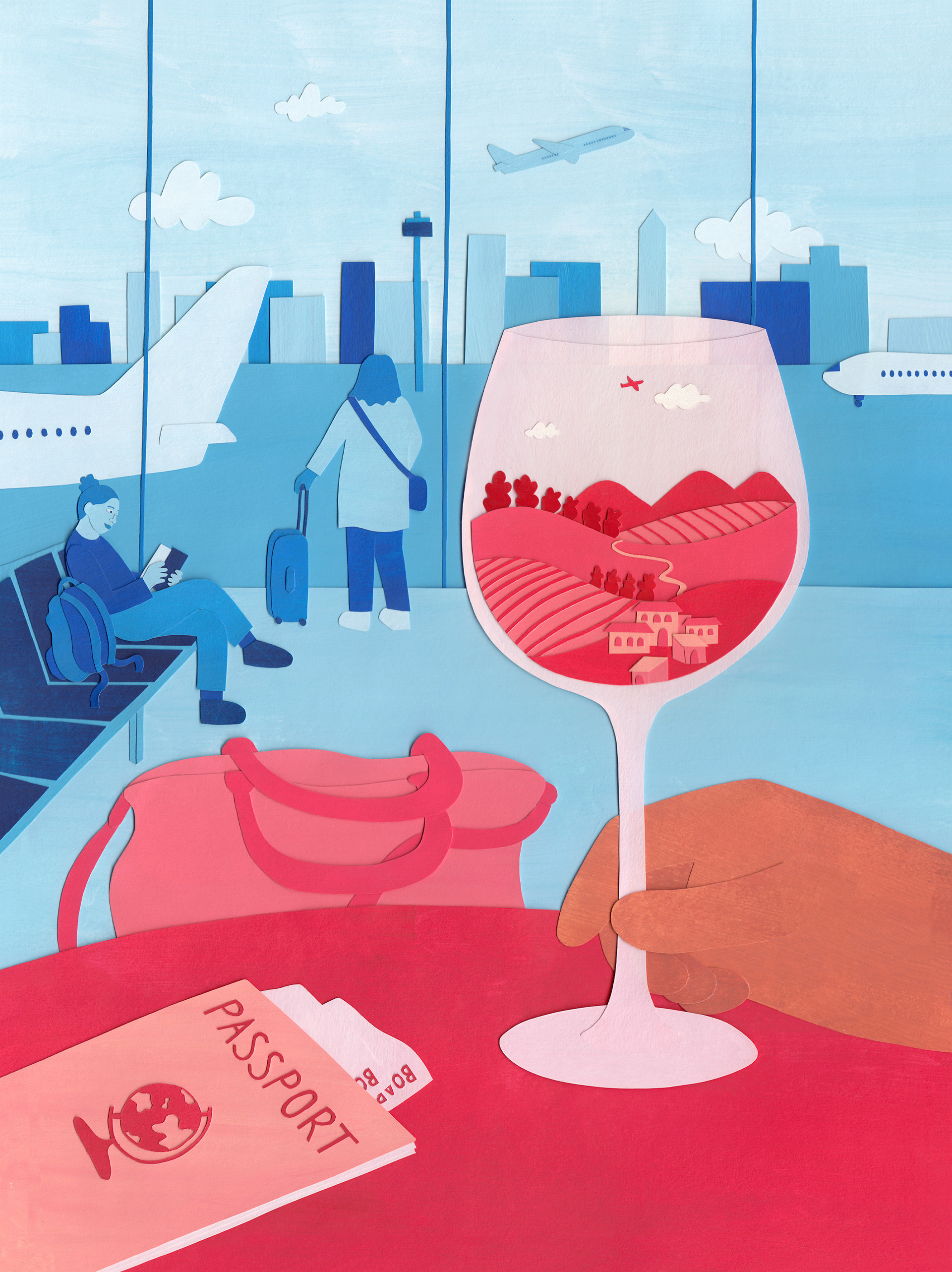 The illustration explores the escapism of a good glass of wine, transporting you to the vineyards before even stepping foot on the plane.